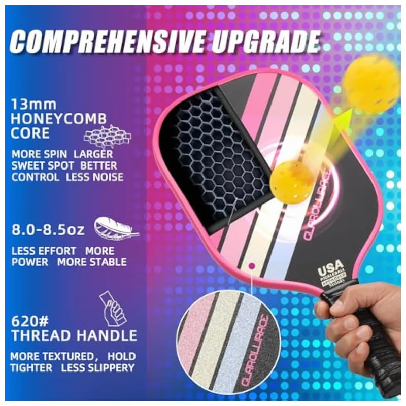 The GLAROLLIRACE Pickleball Paddle Set delivers tournament-ready performance without compromise. Each paddle features a premium S-class fiberglass surface with matte finish — engineered to maximize spin, expand the sweet spot, and improve shot consistency. Combined with a lightweight yet ultra-responsive 13mm polypropylene honeycomb core, these paddles offer exceptional power transfer, reduced vibration, and near-silent impact — critical advantages for high-frequency club use or coaching programs.