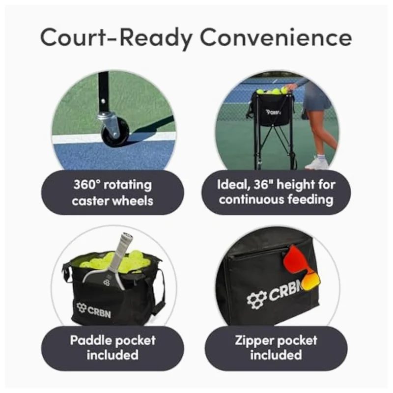 Designed specifically for pickleball professionals, coaching staff, and facility managers, the CRBN Ball Hopper eliminates repetitive bending and ball retrieval — transforming practice flow from fragmented to fluid. Its 100-ball capacity reduces downtime between drills, while the stable, waist-height loading position supports proper posture and injury prevention during extended sessions.